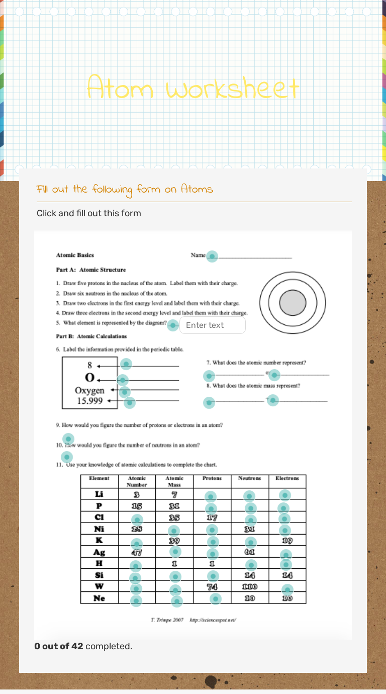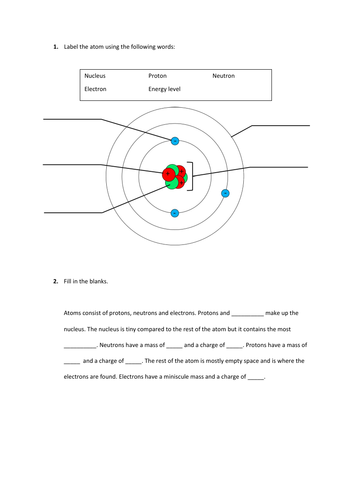 PDF Chemistry of Matter - Science Spot 1. Draw five protons in the nucleus of the atom. Label them with their charge. 2. Draw six neutrons in the nucleus of the atom. 3. Draw two electrons in the first energy level and label them with their charge. 4. Draw three electrons in the second energy level and label them with their charge. 5. What element is represented by the diagram? Structure For The Atom Worksheets - K12 Workbook Displaying all worksheets related to - Structure For The Atom. Worksheets are Atomic structure work, Work 10, Structure of atom, Basic atomic structure work, Structure of atom, Atomic structure practice, Atomic structure work answers, Teacher workbooks. *Click on Open button to open and print to worksheet. 1. Atomic Structure Worksheet. Label an atom worksheet - Liveworksheets.com ID: 306645 Language: English School subject: Natural Science Grade/level: 4th Age: 9-10 Main content: Electricity Other contents: atom Add to my workbooks (42) Add to Google Classroom Add to Microsoft Teams Share through Whatsapp PDF The Atom for Middle School - Miss Little's Classroom Website 2. The Atomic Model Worksheet and Key 3. The Atomic Model of Matter Graphic Organizer and key 4. Atomic Model of Matter Worksheet and key 5. Atom Notes 6. Complete Model of Atom Graphic Organizer and Key 7. Vocabulary Review and Key 8. Periodic Table 9. Understanding the Atom - Finding Numbers of Protons, Neutrons, Electrons and Key 10.