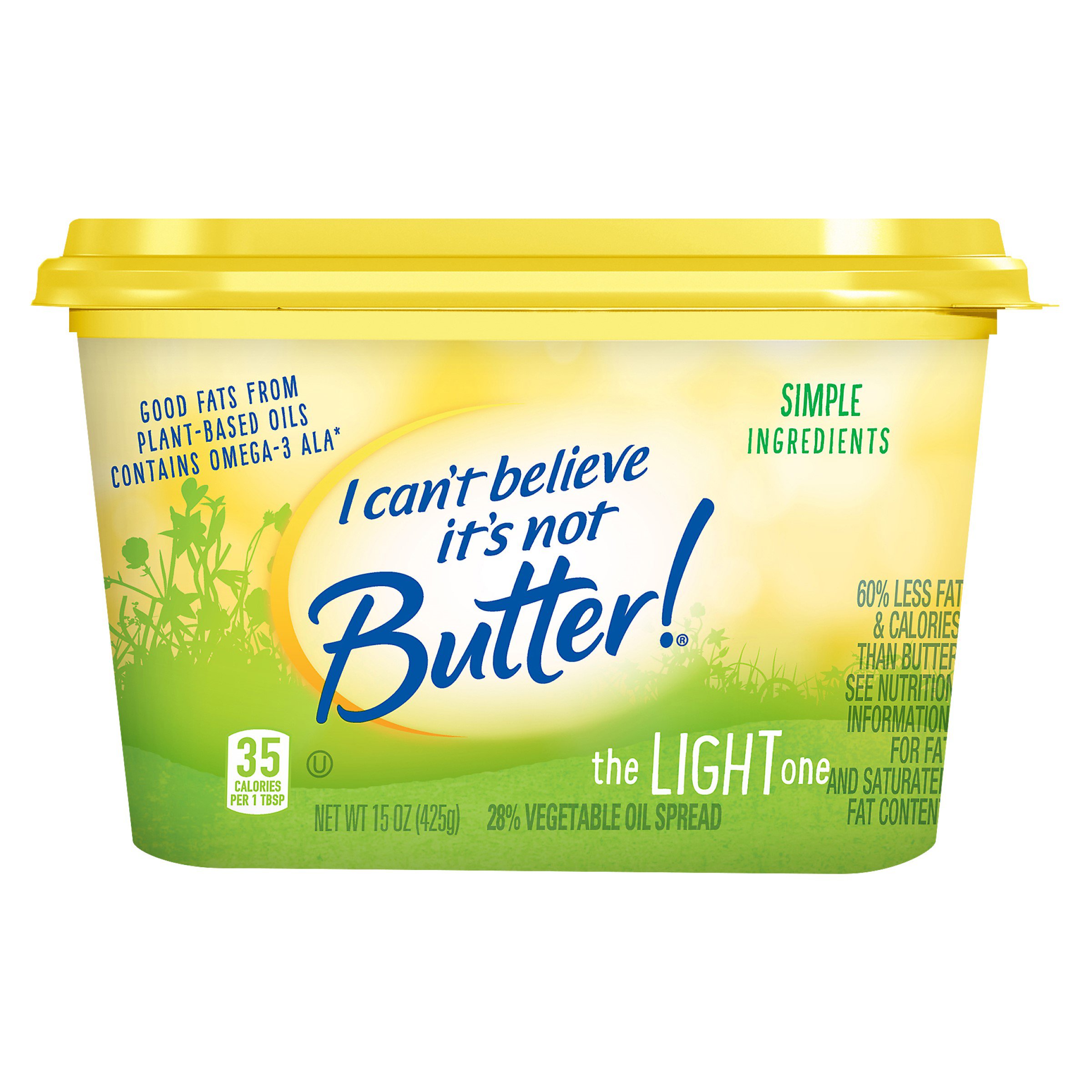 I Can't Believe It's Not Butter! Light Spread - H-E-B Light is made with good fats from plant-based oils and contains omega-3 ALA. Made with real, simple ingredients, just a delicious blend of oils, purified water and a pinch of salt. I Canu001at Believe Itu001as Not Butter! Light has amazing fresh butter taste with 80% less saturated fat and 60% fewer calories than butter.