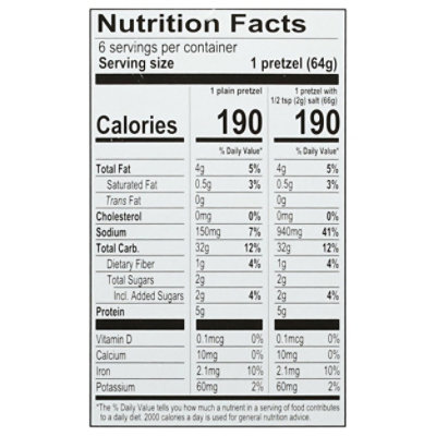 Super Pretzel Soft Pretzels - Shop Bread & Baked Goods at H-E-B Nutrition Facts Soft Pretzels Serving Size 1.00 pretzel (64g) Serving Per Container 15 Amount Per Serving %DV Soft Pretzels Serving Size 0.00 (64g) Serving Per Container (pretzel with 0.167 salt pak) Amount Per Serving %DV Calcium 0% Iron 10% IS or Contains: Kosher,Wheat
