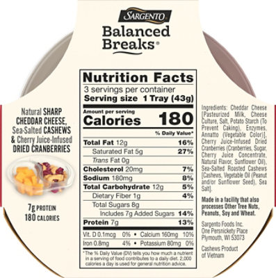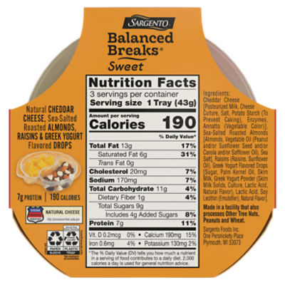 Calories in Sargento Balanced Breaks Natural White Cheddar with Almonds ... Nutrition summary: There are 190 calories in 1 tray (43 g) of Sargento Balanced Breaks Natural White Cheddar with Almonds and Cranberries. Calorie breakdown: 61% fat, 25% carbs, 15% protein.
