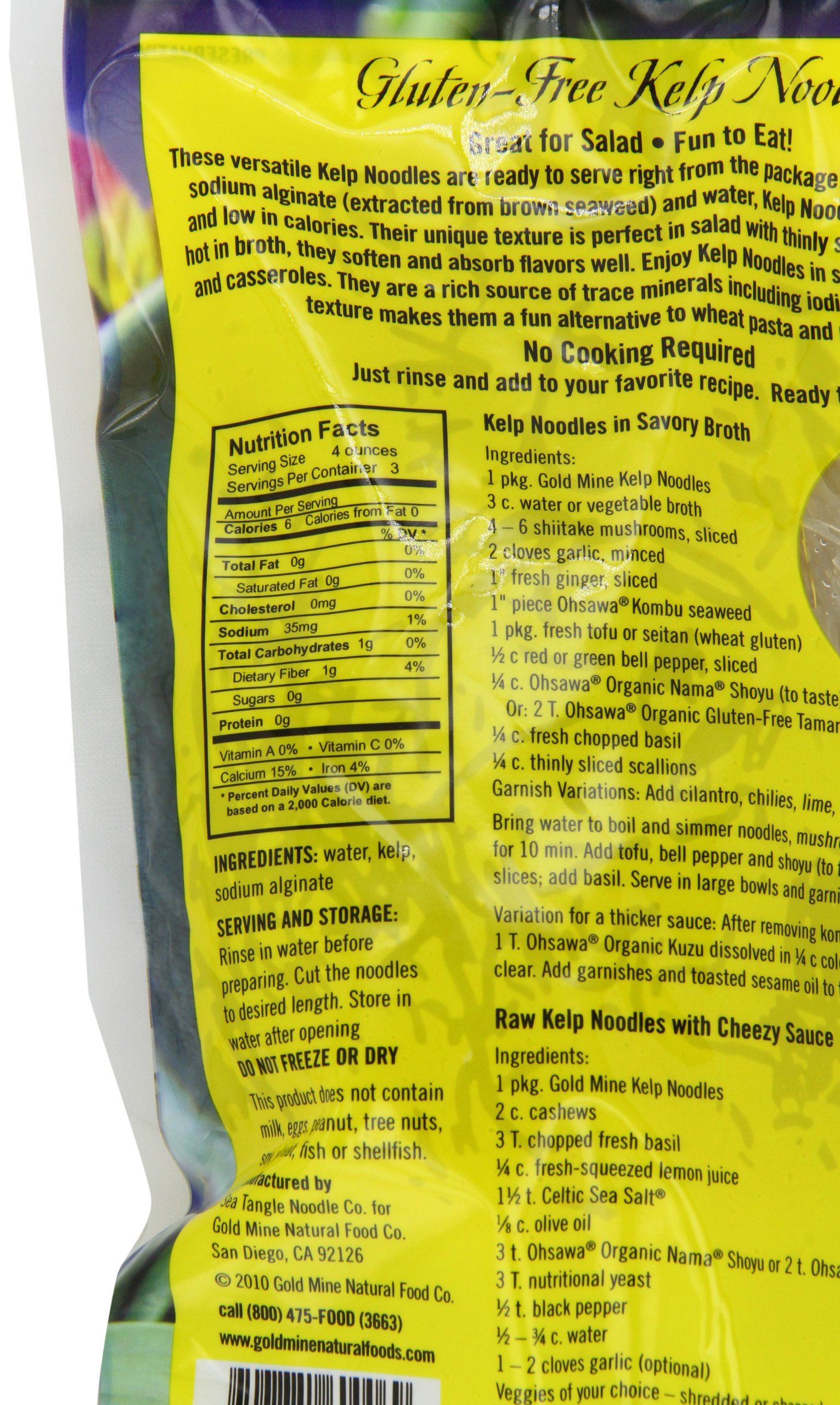 Gold Mine Kelp Noodles, 16 oz, (Pack of 12) - Walmart.com Gold Mine Kelp Noodles: Ready to eat; Low carb; Contains no preservatives; Only 6 calories per serving; 16 oz sea kelp noodles in a pack of 12 are fat-free; Made with mineral-rich sea kelp; Gluten-free kelp noodles; Free of all common allergens; Fun and crunchy texture that is enjoyable to eat; Substitute with wheat or rice noodles