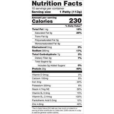 Beyond Meat Beyond Burger, Plant-Based Patties - Fooducate Nutrition Serving Size: 1 patty (113g) Amount per Serving My Daily Value Calories 230 Kcal 14% Total Fat 14 g 22% Saturated Fat 5 g 29% Trans Fat 0 g 0% Cholesterol 0 mg 0% Sodium 390 mg 17% Potassium 330 mg 7% Total Carbohydrate 7 g 3% Dietary Fiber 2 g 8% Sugars 0 g 0% Added Sugars 0 g 0% Protein 20 g 42% Calcium 100 mg 10% Iron 3.6 mg 20%