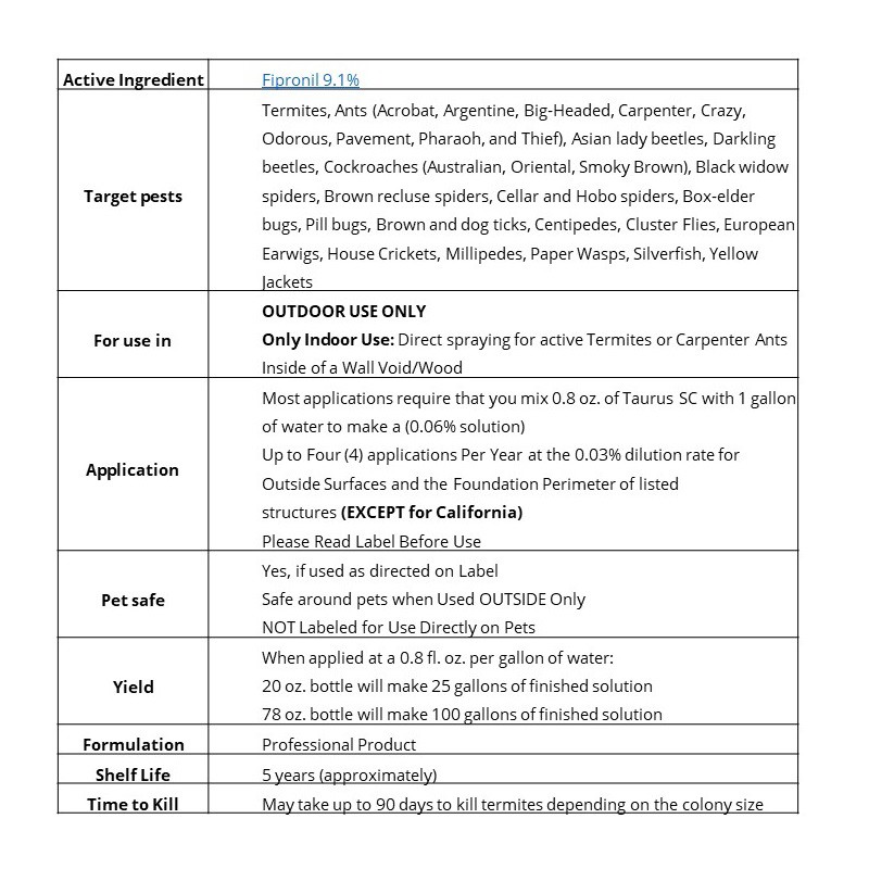 TAURUS SC - PEST CONTROL CHEMICALS 800-877-7290 - bug spray PRODUCT DESCRIPTION: Taurus is generic version of Termidor, the # 1 termiticide in the United States. ... INSECTICIDE: DUSTS; INSECTICIDE: GELS; INSECTICIDES: GRANULES; INSECTICIDE: INSECT GROWTH REGULATORS ... PRODUCT DOCUMENTS: SPECIMEN LABEL MSDS SHEET . $90.00 (455798) 20 OZ Order online and save 5%. $195.00 (455799) 78 OZ. Order online and ...