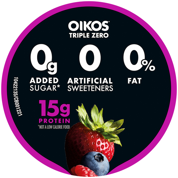 Mixed Berry Oikos Triple Zero High Protein Nonfat Greek Yogurt I chose triple zero mixed berries. It is nice and creamy and really thick. It's sweet but not too sweet, does not have added sugar. It has 15 g of protein and ... Oikos Triple Zero Mixed Berry Flavored Nonfat Yogurt, 5.3 oz, 4 count <90kcal. Calories ; 0g. Total Fat ; <5g. Total Sugars ; <60mg. Sodium. Dannon Oikos Triple Zero Mixed Berry Greek Yogurt - H-E-B Oikos Triple Zero Greek Nonfat Yogurt gives you all the flavor you seek in a Greek yogurt--but with 0 added sugar*, 0 artificial sweeteners, and 0 fat, ...