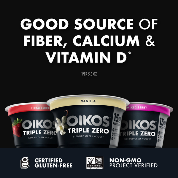 Oikos Triple Zero Mixed Berry Blended Greek Yogurt - King Kullen 0 g added sugar (Not a low calorie food). 0% fat. Certified Gluten-Free. Nonfat. Vitamin D. More Reasons to Love Triple Zero: Complete protein; ... Calories in Dannon Oikos Triple Zero Mixed Berry - Nutritionix Dannon Oikos Triple Zero Mixed Berry ; Calories 1 ; % Daily Value* ; Total Fat 0g grams 0% Daily Value ; Saturated Fat 0g grams 0% Daily Value ; Trans Fat 0g grams.