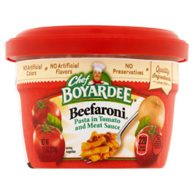 CHEF BOYARDEE Beefaroni, Macaroni w/Beef in tomato Sauce, canned... Nutrition facts label for CHEF BOYARDEE Beefaroni, Macaroni w/Beef in tomato Sauce, canned entree This feature requires Flash player to be installed in your browser. Download the player...