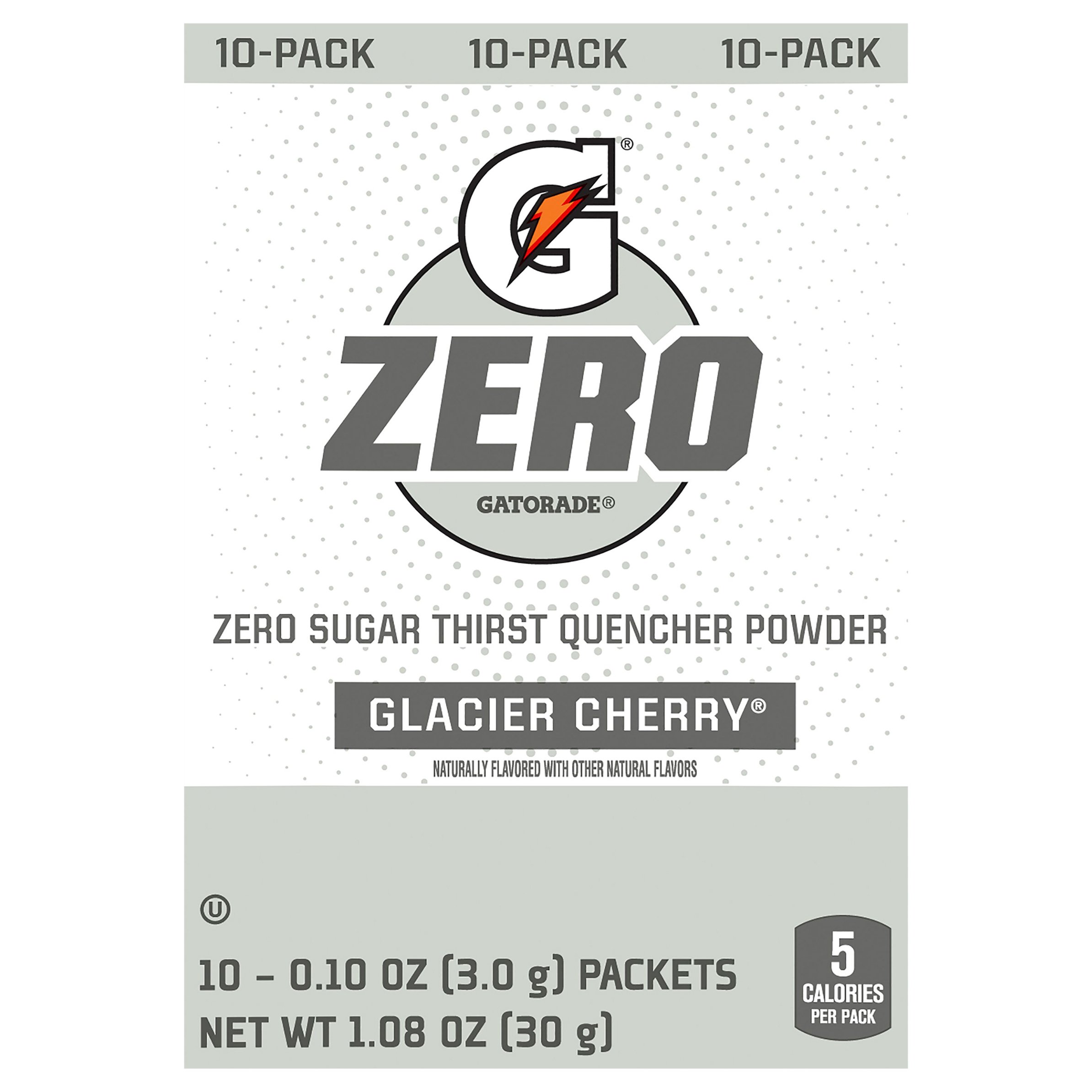 Gatorade Zero Sugar Glacier Cherry Thirst Quencher Powder Gatorade Zero has 0 G sugar with the same electrolytes as Gatorade Thirst Quencher. ... Less than 5g net carbs. Nutrition and ingredients. Nutrition Facts. 10. servings per container. Serving Size. 1.00 packet. Amount Per Serving. ... You should not rely solely on the information presented here. Always read labels, warnings and directions ...