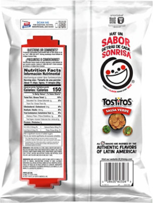 TOSTITOS® SABRITAS® Salsa Verde Enjoy the crunch of TOSTITOS® Crispy Rounds Tortilla Chips with the mild heat and full flavor of salsa verde. TOSTITOS® Sabritas® Salsa Verde Flavored Tortilla Chips are our most popular flavor in Mexico, and after just one chip, you'll see why! ... Calories: 150: Calories from Fat: 63 % Daily Value* Calories 150: Fat 7g: 11%: Saturated 1g ...